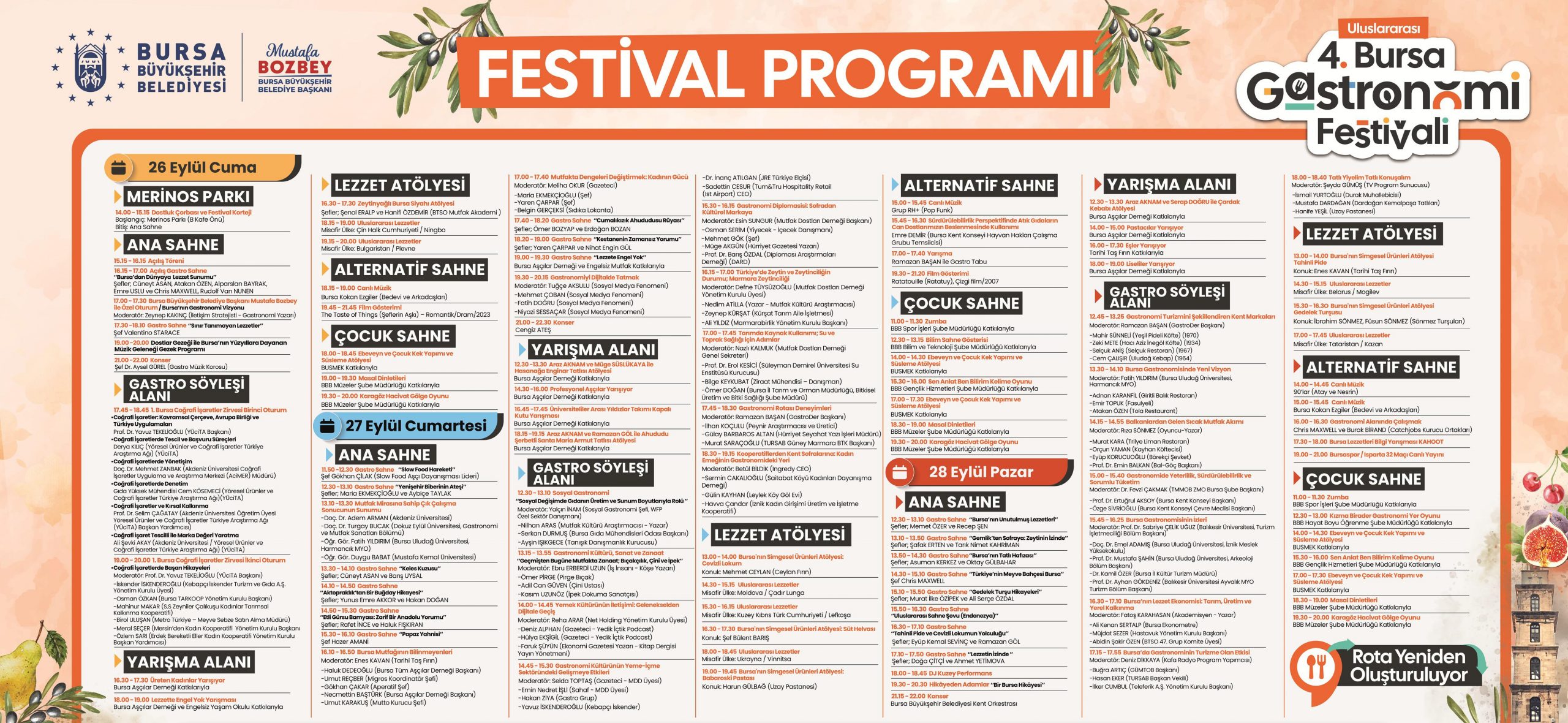 Gastro ekonomi ve tarım, sosyal gastronomi, kültür-sanat ve gastro turizm ekseninde gerçekleşecek olan festival; Mudanya’dan Karacabey’e, İznik’ten Orhaneli’ye kadar tüm ilçelere yayılacak. Yerel şeflerle birlikte ulusal ve uluslararası konukların de katılacağı festivalde, atölyeler, yarışmalar, tadım ve tanıtım programları, söyleşi ve paneller, şef buluşmaları, üretici ziyaretleri ve kültürel etkinlikler düzenlenecek. Ünlü şeflerin Bursa esnafıyla da buluşacağı festivalde, gastronominin kültürde, sinemada ve anlatıda da iz bıraktığını ortaya koyan film, açık hava gösterimleri ve yönetmen-yapımcı katılımlı sohbetler de yer alacak.