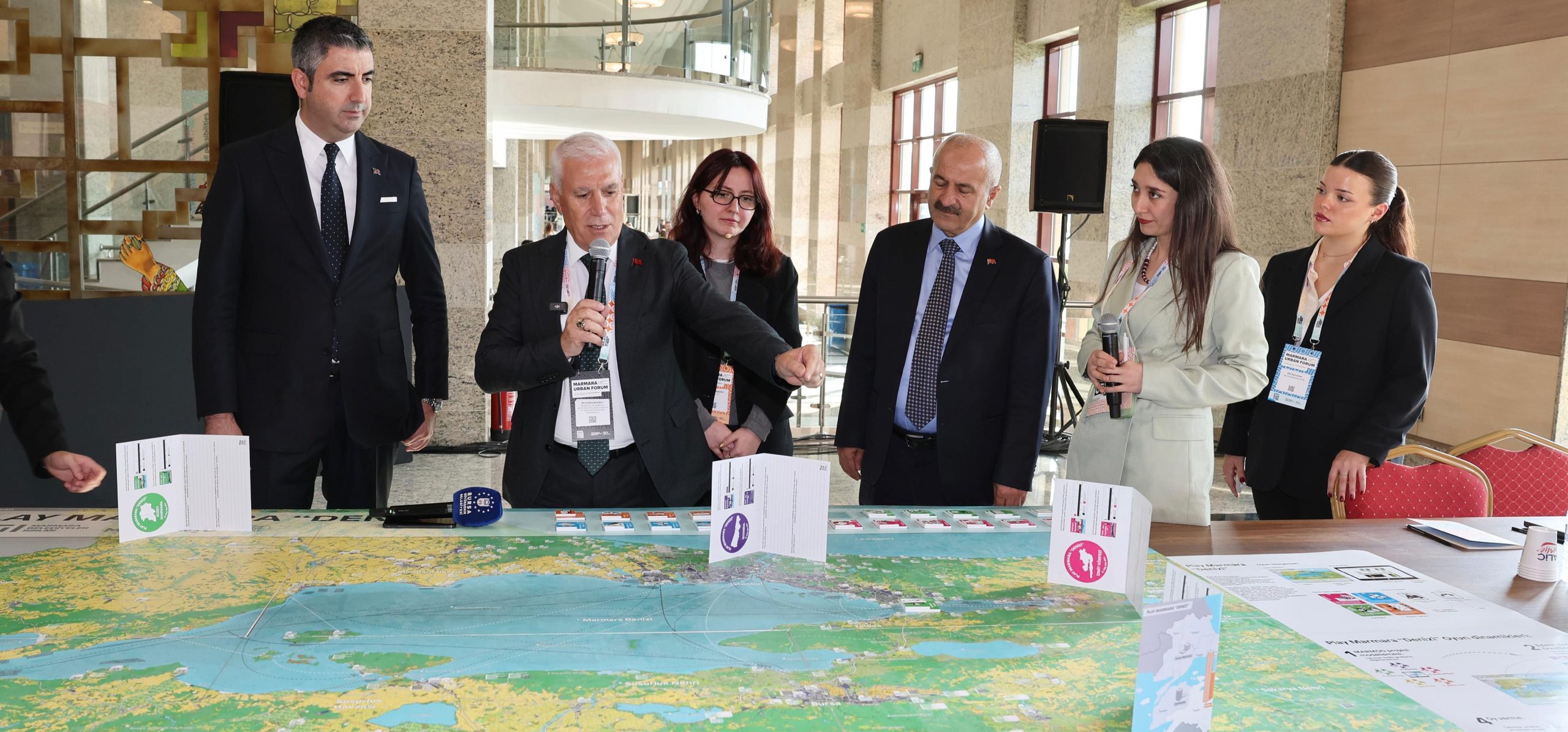 MARUF’25 kapsamında düzenlenen ‘Play Marmara Denizi’ etkinliğine de katılan Başkan Mustafa Bozbey, oyunu Gebze Belediye Başkanı Zinnur Büyükgöz ve Kartal Belediye Başkanı Gökhan Yüksel ile birlikte oynadı. ‘Temiz Üretim, Yenilikçi Uygulamalar’ kartını seçen Başkan Mustafa Bozbey, “Marmara Denizi’ne sahip çıkmalıyız. Marmara’nın etrafında yoğun sanayi yapılanması var. Buna bağlı olarak da 30 milyonun üzerinde bir nüfus Marmara Bölgesi’nde yaşıyor. Bu da Marmara Denizi’ne inanılmaz bir kirlilik yükü getiriyor. Bunu önlemenin yolu, Marmara’ya kıyısı olan tüm belediyelerin İleri Biyolojik Arıtma tesisi kurmasından geçiyor. Böylece Marmara Denizi’ne arıtılmış sular salınmış olacak. Marmara Denizi’ni, tüm ülke olarak el ele vererek kurtarmalıyız” dedi.